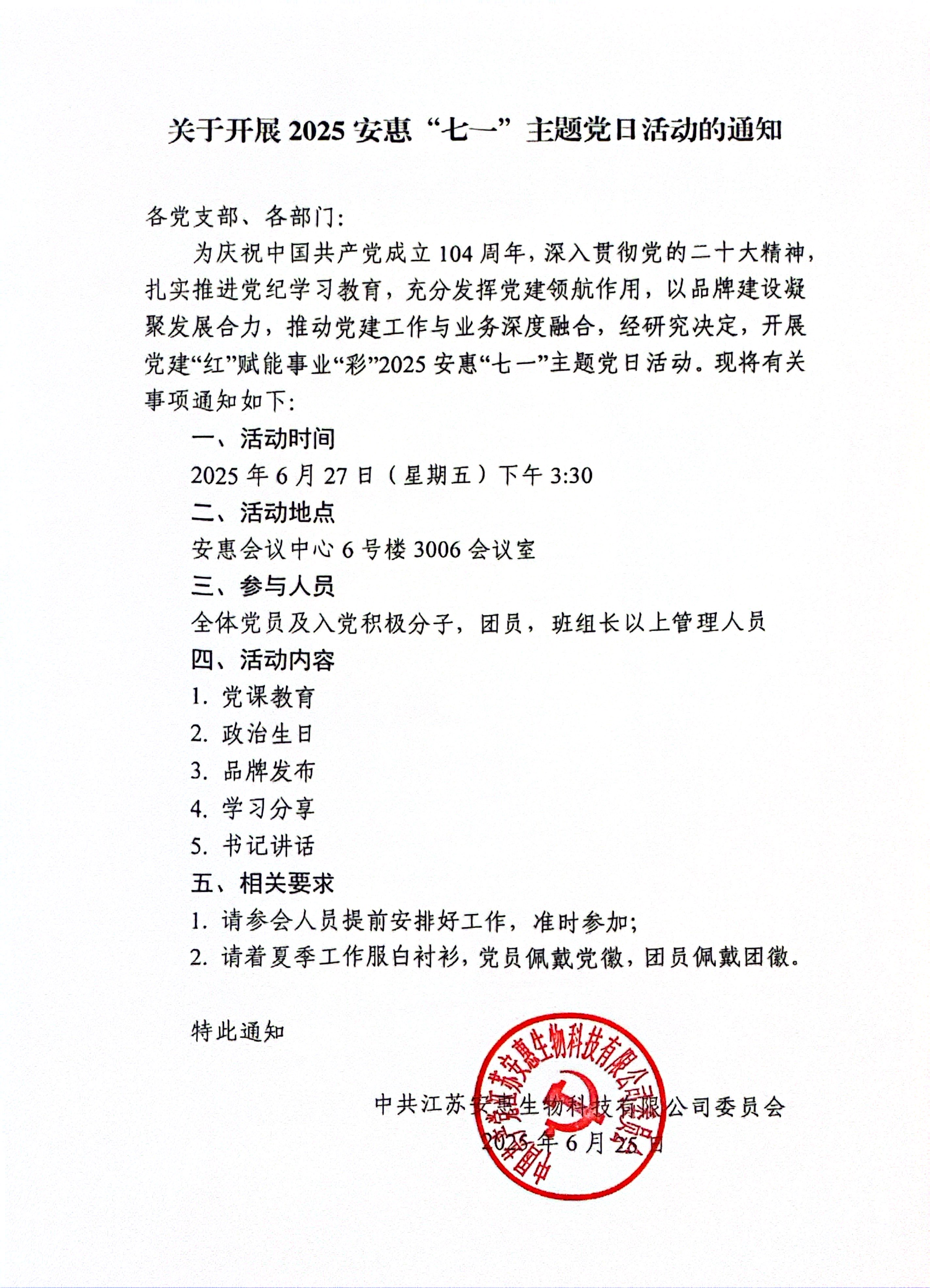 關于開展2025安惠“七一”主題黨日活動的通知