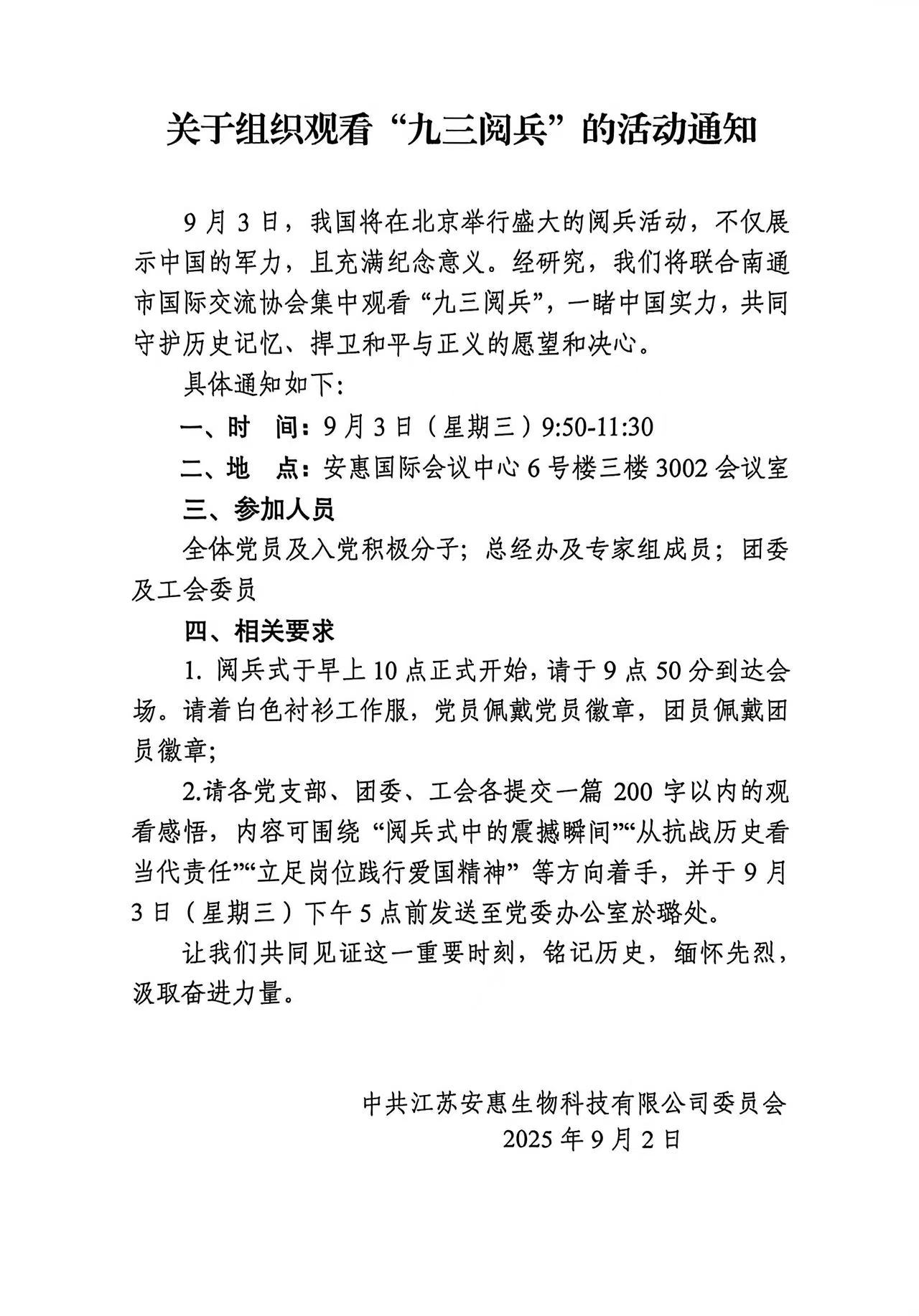 關于組織觀看“九三閱兵”的活動通知