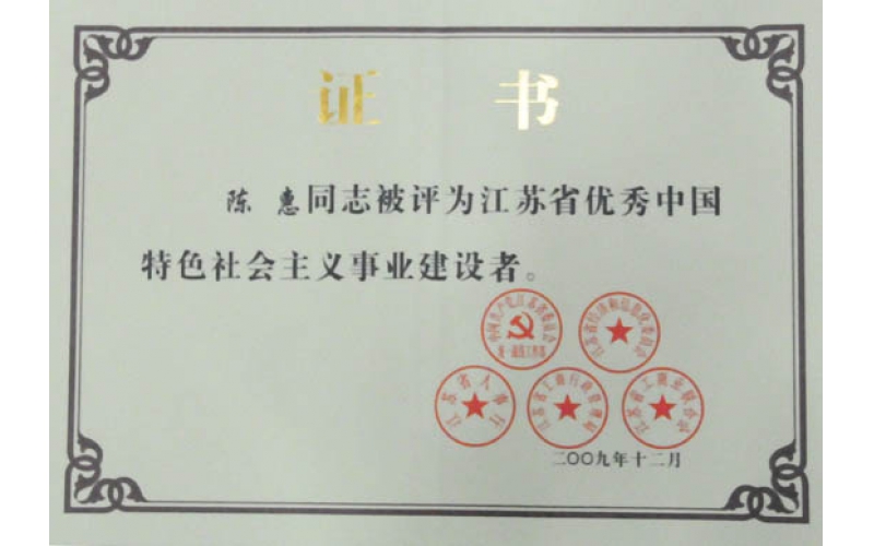 2009年12月,陳惠董事長(zhǎng)榮獲江蘇省第四屆“優(yōu)秀中國(guó)特色社會(huì)主義事業(yè)建設(shè)者”稱(chēng)號(hào)。