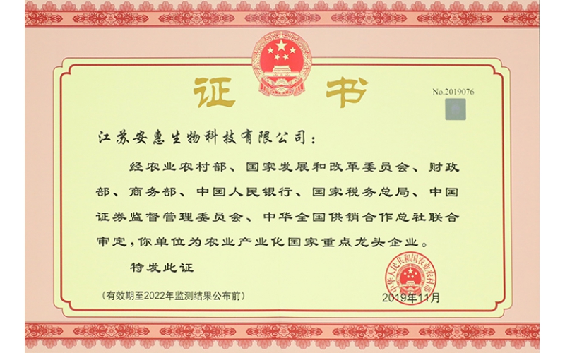 2019年12月,經各?。▍^、市)遴選推薦、嚴格把關,專家評審和全國農業產業化聯席會議審定,農業農村部公布了第六批300家農業產業化國家重點龍頭企業名單,江蘇安惠生物科技有限公司榜上有名。