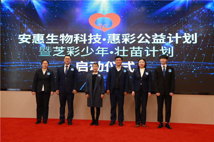 安惠公司副董事長陸漢萍、副總經理曹昌貴、總經理助理鄭林國、教育總監鄭曉耘、團委書記葛玉林、安惠青春飛揚志愿“彩”計劃小分隊陳駿驊共同啟動“安惠生物科技·惠彩公益計劃”暨“芝彩少年·壯苗計劃”。