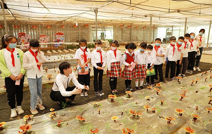 在安惠江海志愿者陳駿驊的帶領下,孩子們來到蕈菌園近距離觀看靈芝寶寶的栽培和生長。初夏時節,蕈菌園里的靈芝初長成,嬌白嫩黃,亭亭玉立,孩子們忍不住看一看、摸一摸、聞一聞,感受這些精靈們的美好和神奇。靈芝是怎么長出來的?多久可以成熟?千年靈芝真的存在嗎?孩子們邊參觀邊提問,靈芝文化的種子在心中悄然播種。