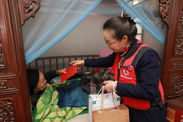 在100周歲的羌蘭芹和101周歲的李永圣兩位老人家中,安惠公司副董事長陸漢萍和他們親切交談,并送上慰問金、芝草玉液酒、博谷茶和菌菇等慰問物資,祝愿他們身體健康、幸福綿長。她說,家有一老,如有一寶,我們要用實際行動多給老人關心和關愛,讓所有老人都能有一個幸福美滿的晚年。