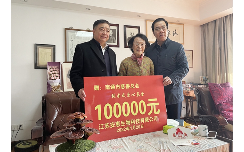 2022年1月20日,安惠公司董事長陳惠、南通市慈善總會副會長葉沈良來到張柔武老人家中,通過安惠健康公益基金向張柔武愛心基金捐贈10萬元,助力“情暖江海”春節慰問活動。